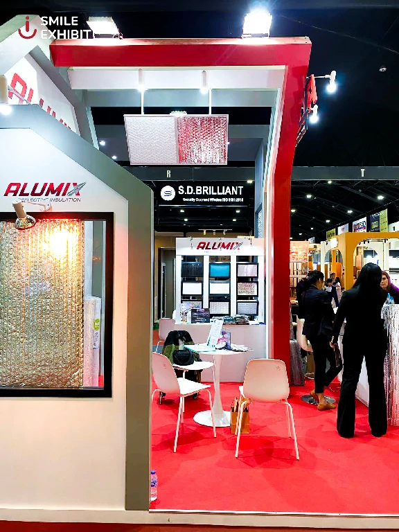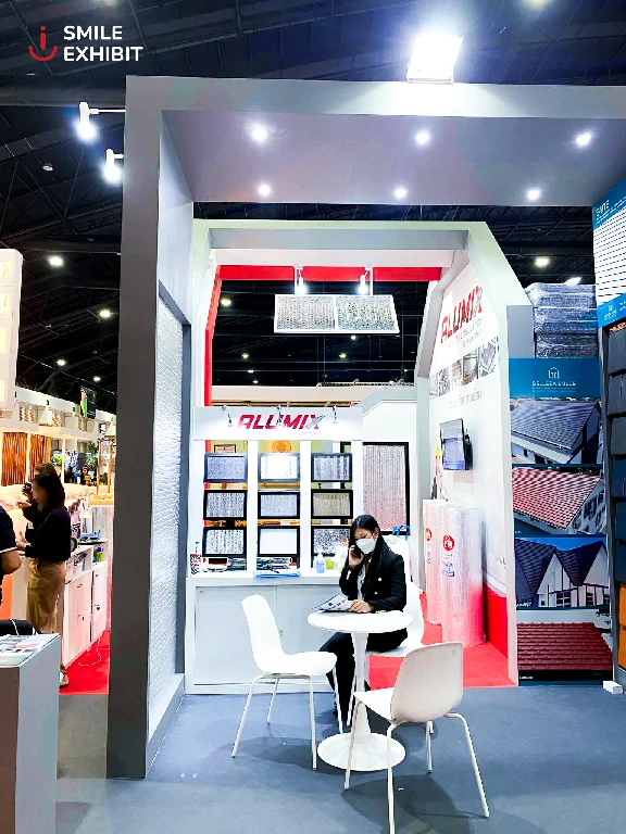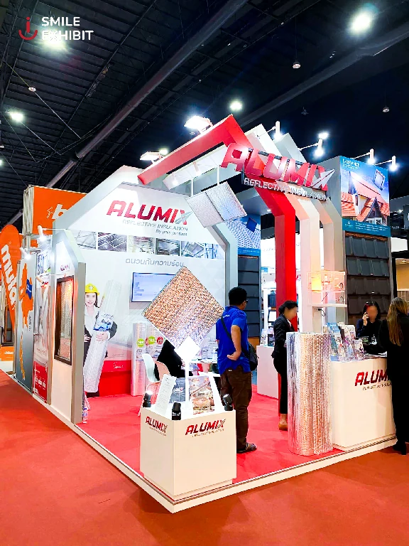 ภายในบูธมีการจัดแบ่งพื้นที่อย่างชัดเจน ทั้งในส่วนจัดแสดงผลิตภัณฑ์และพื้นที่ให้ข้อมูลผู้สนใจ โดยใช้โทนสีแดง-ขาวที่ไม่เพียงสะท้อนตัวตนของแบรนด์ ALUMIX แต่ยังสื่อถึงคุณสมบัติเด่นของฉนวนสะท้อนความร้อนอย่างชัดเจนและทรงพลัง