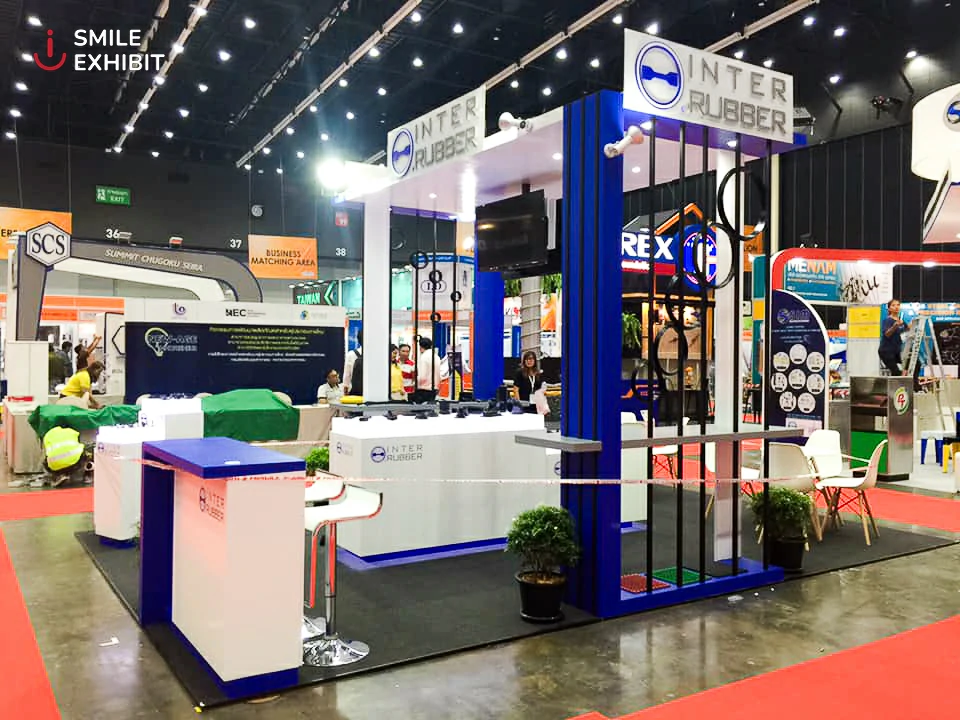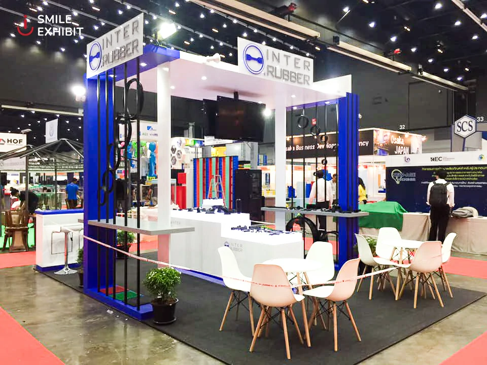 บูธ INTER RUBBER ผู้ผลิตชิ้นส่วนยางให้กับอุตสาหกรรมยานยนต์ที่มีชื่อเสียงระดับโลกหลายบริษัทและยังมีสินค้าอื่นๆ อีกมากมาย ไม่ว่าจะเป็น เครื่องใช้ไฟฟ้า เครื่องจักร สิ่งก่อสร้าง ฯลฯ บูธนี้เราตกแต่งด้วยสีน้ำเงินที่เป็นสีประจำของบริษัท และเพิ่มความสวยงามและการบ่งบอกถึงสินค้าหรือบริการของบริษัท Inter Rubber ด้วยยางรถยนต์สีดำ อีกทั้งยังมีการเว้นพื้นที่สำหรับผู้ที่เข้ามาติดต่อ ต้องการคำปรึกษาหรือสนใจในสินค้าของบริษัท