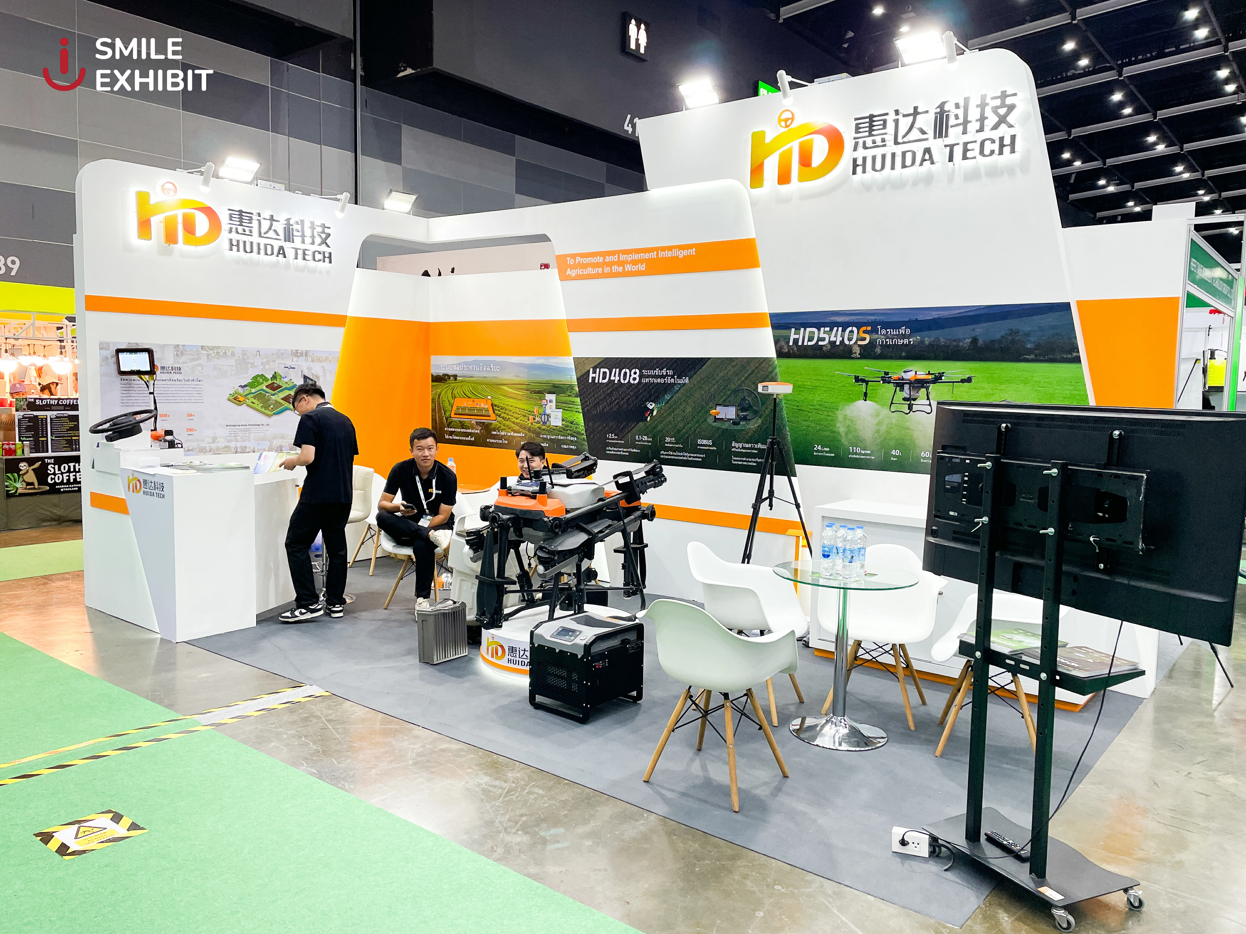 มีทั้งพื้นที่ต้อนรับ พื้นที่สาธิต และโต๊ะเจรจาธุรกิจ จัดแบ่งพื้นที่อย่างเป็นสัดส่วน มี Backdrop ขนาดใหญ่ พร้อมกราฟิกแสดงฟังก์ชันของสินค้าและภาพการใช้งานจริงในภาคเกษตร