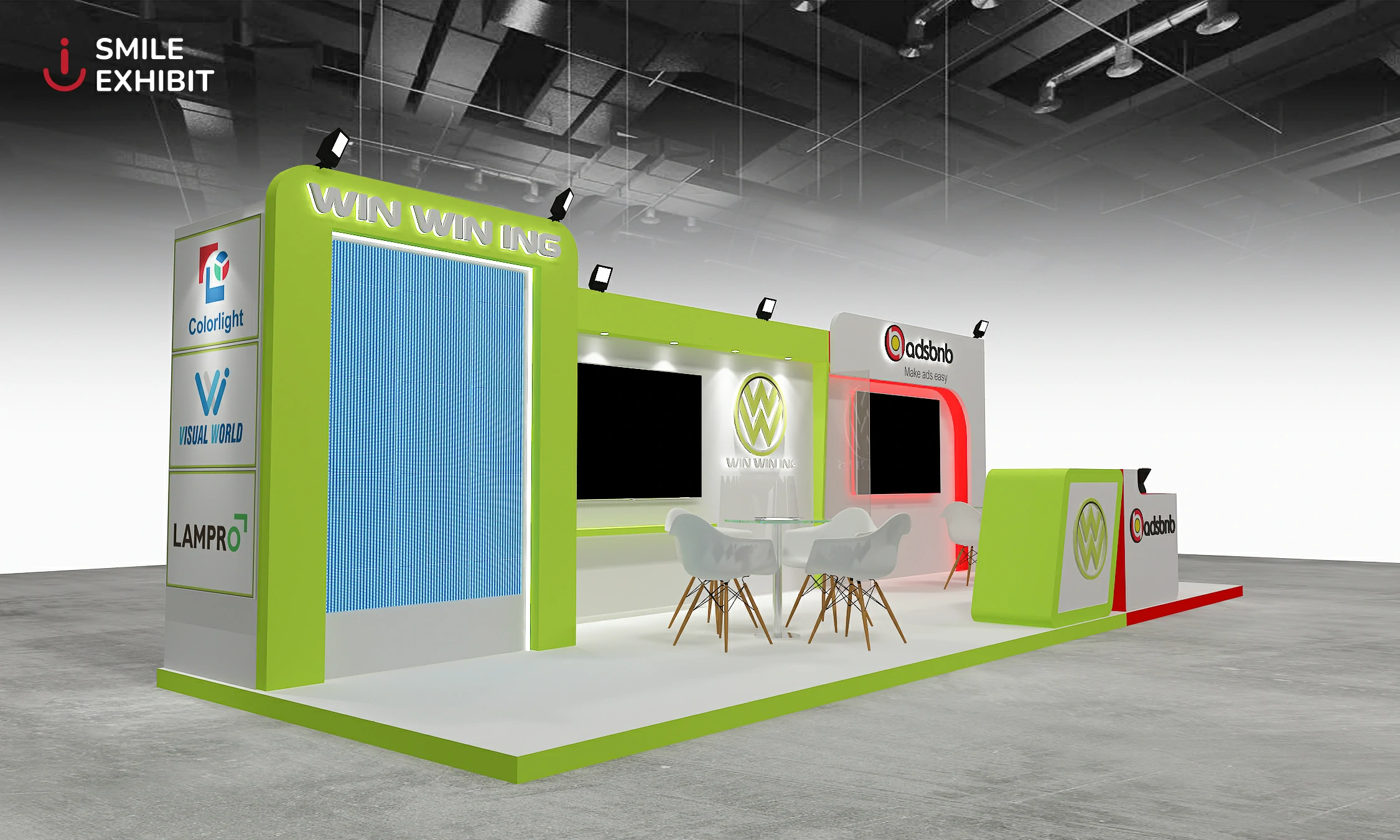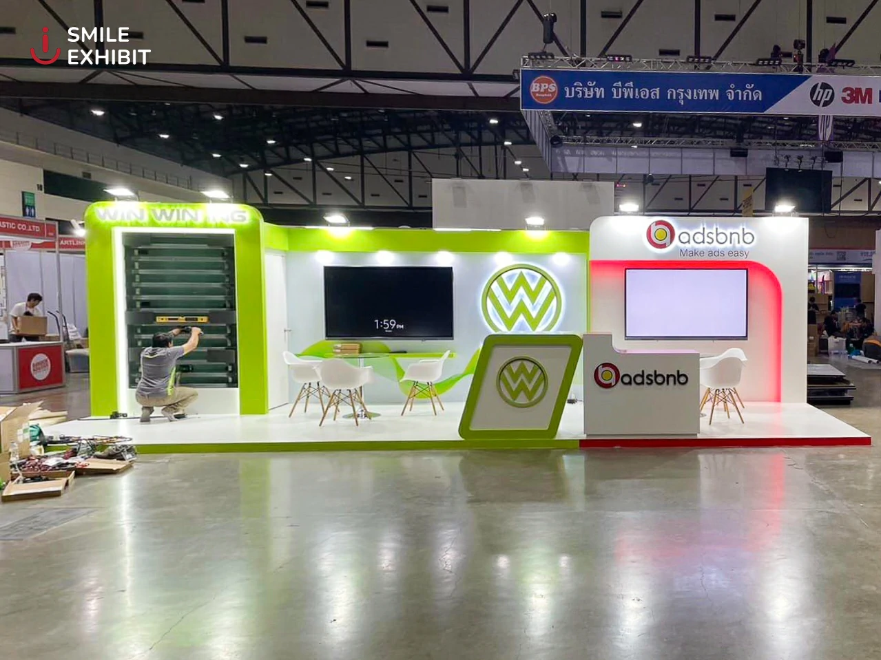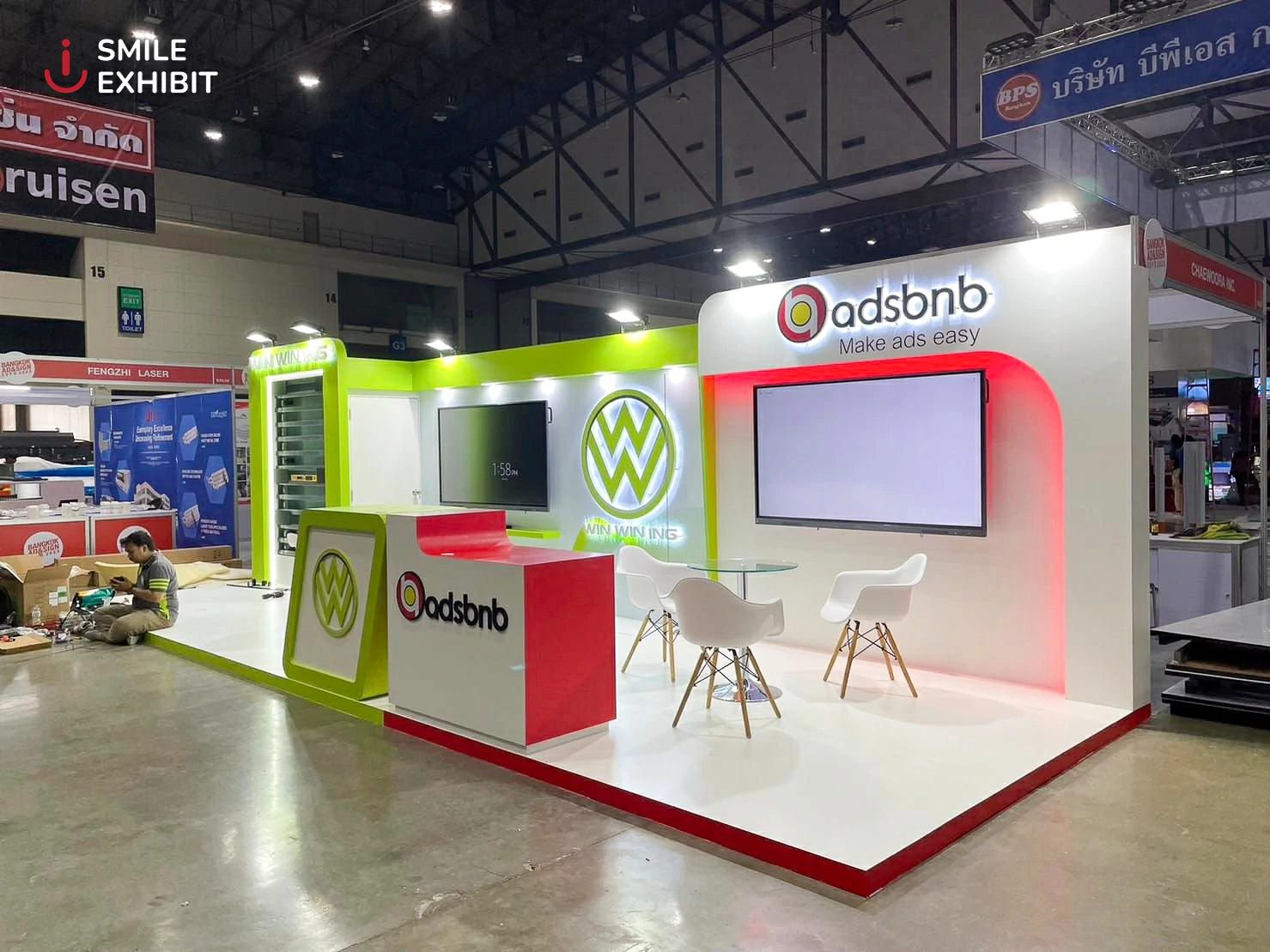 บูธ WIN WIN ING ในงาน BANGKOK AD & SIGN EXPO 2023 งานแสดงนวัตกรรมการพิมพ์ระบบดิจิทัลสำหรับงานผลิตป้ายและสื่อโฆษณา ถูกออกแบบให้สะดุดตาด้วยโทนสีเขียว-ขาว ซึ่งเป็นเอกลักษณ์ของแบรนด์ ผสมผสานดีไซน์ที่ดูสะอาด ทันสมัย และเป็นมิตรกับผู้เข้าชม
