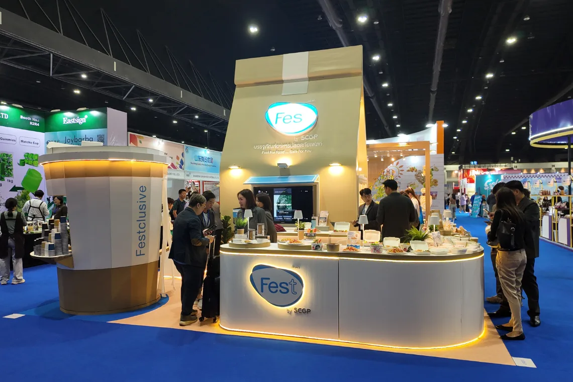 การเริ่มต้นเล่าเรื่องที่ง่ายที่สุด คือการทำให้ลูกค้า "เห็นปุ๊บ รู้ปั๊บ" ว่าเราขายอะไร เช่น Fest (โดย SCGP) ที่สลัดภาพชั้นวางแบบเดิมๆ มาเนรมิตบูธเป็นรูปทรงกล่องอาหารและแก้วน้ำขนาดยักษ์ ตอกย้ำภาพจำบรรจุภัณฑ์รักษ์โลกได้อย่างทรงพลัง พร้อมโซน FestClusive ที่โชว์สินค้าบนดีไซน์โค้งมนดูสะอาดตา