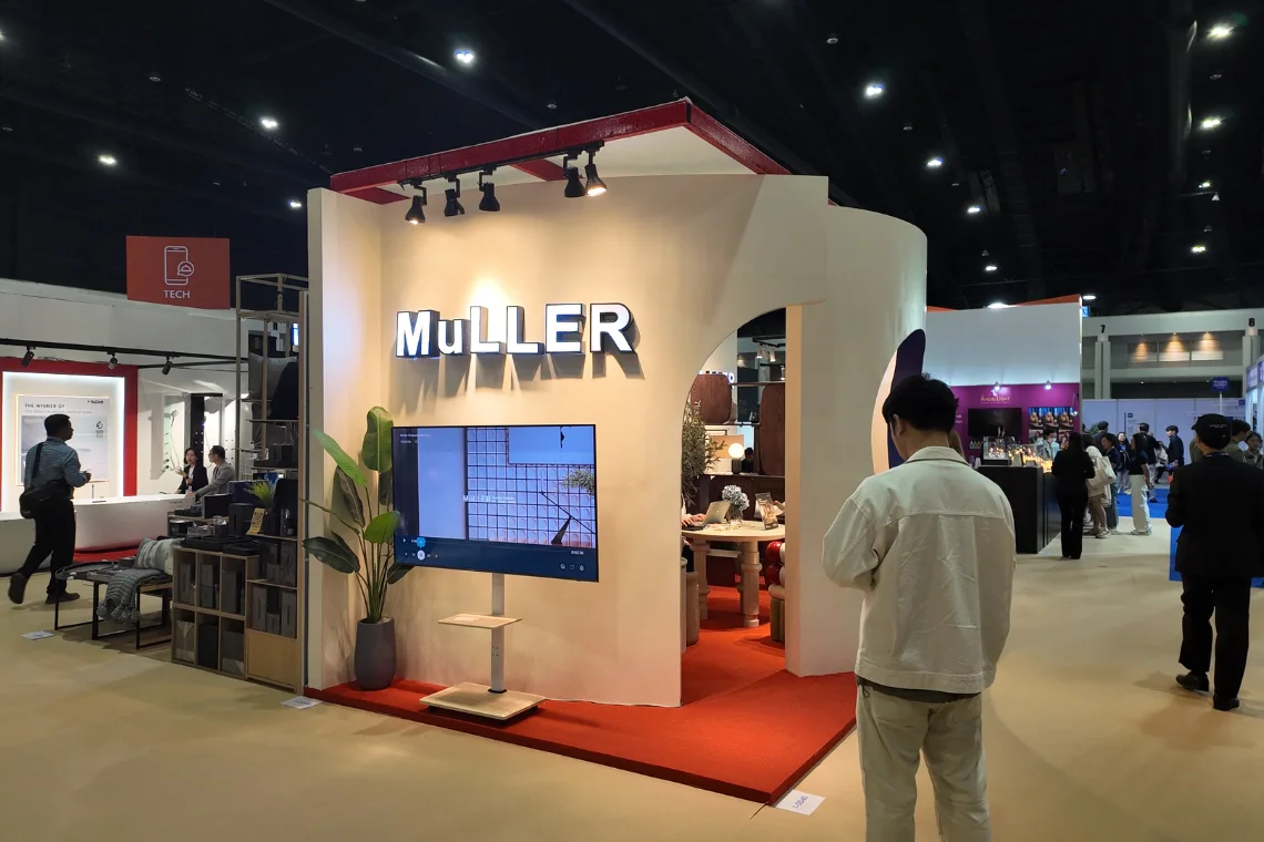 ส่วนแบรนด์ MULLER มาในสไตล์ Minimal ที่เรียบง่ายแต่ดูแพง ใช้เส้นสายโค้งมนและโทนสีครีมละมุนตา เป็นตัวอย่างของการจัดวางเฟอร์นิเจอร์ที่ส่งเสริมให้สินค้าดูเด่นขึ้นมาโดยไม่ต้องใช้กราฟิกที่ซับซ้อน