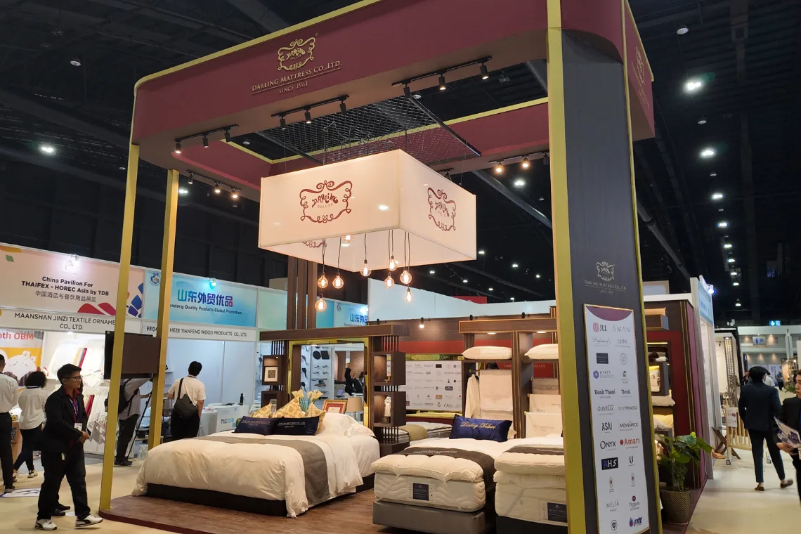 เทรนด์ที่มาแรงมากในปีนี้คือการทำให้ลูกค้ารู้สึกผ่อนคลายเหมือนอยู่ในสถานที่จริง โดยเฉพาะกลุ่มเครื่องนอนและเฟอร์นิเจอร์ Darling Mattress เลือกใช้โครงสร้างโทนสีแดงเข้มตัดทอง พร้อมสาดแสงไฟ Warm White สร้างบรรยากาศห้องนอนระดับ 5 ดาวที่ดูหรูหราแต่แฝงด้วยความอบอุ่น