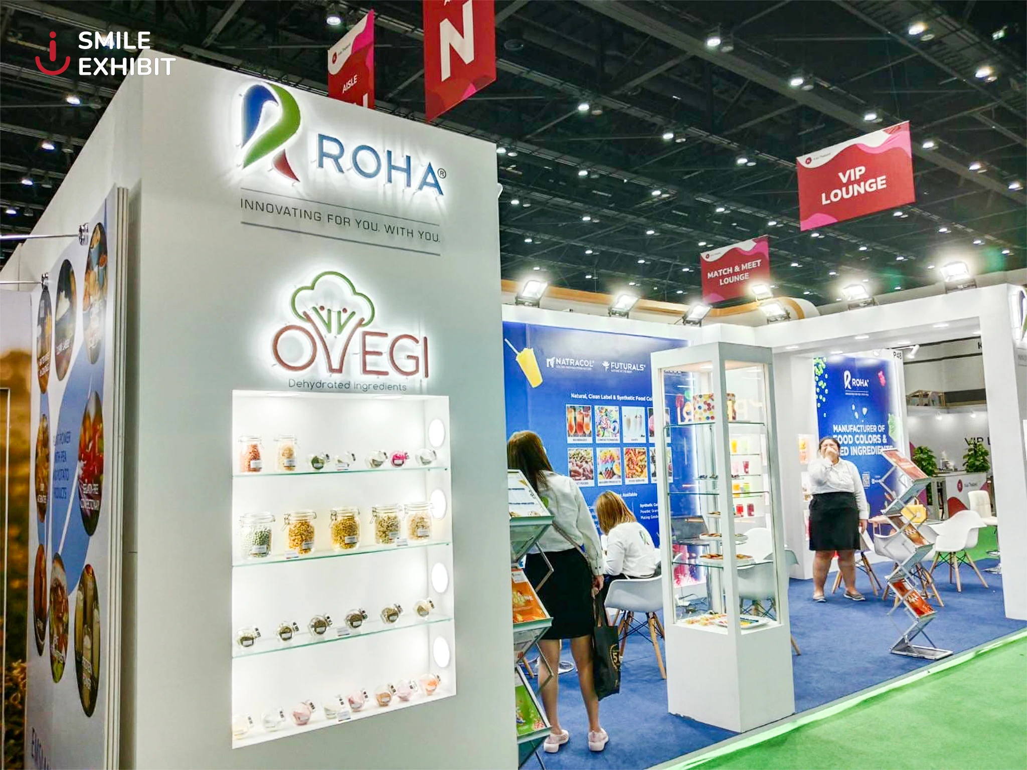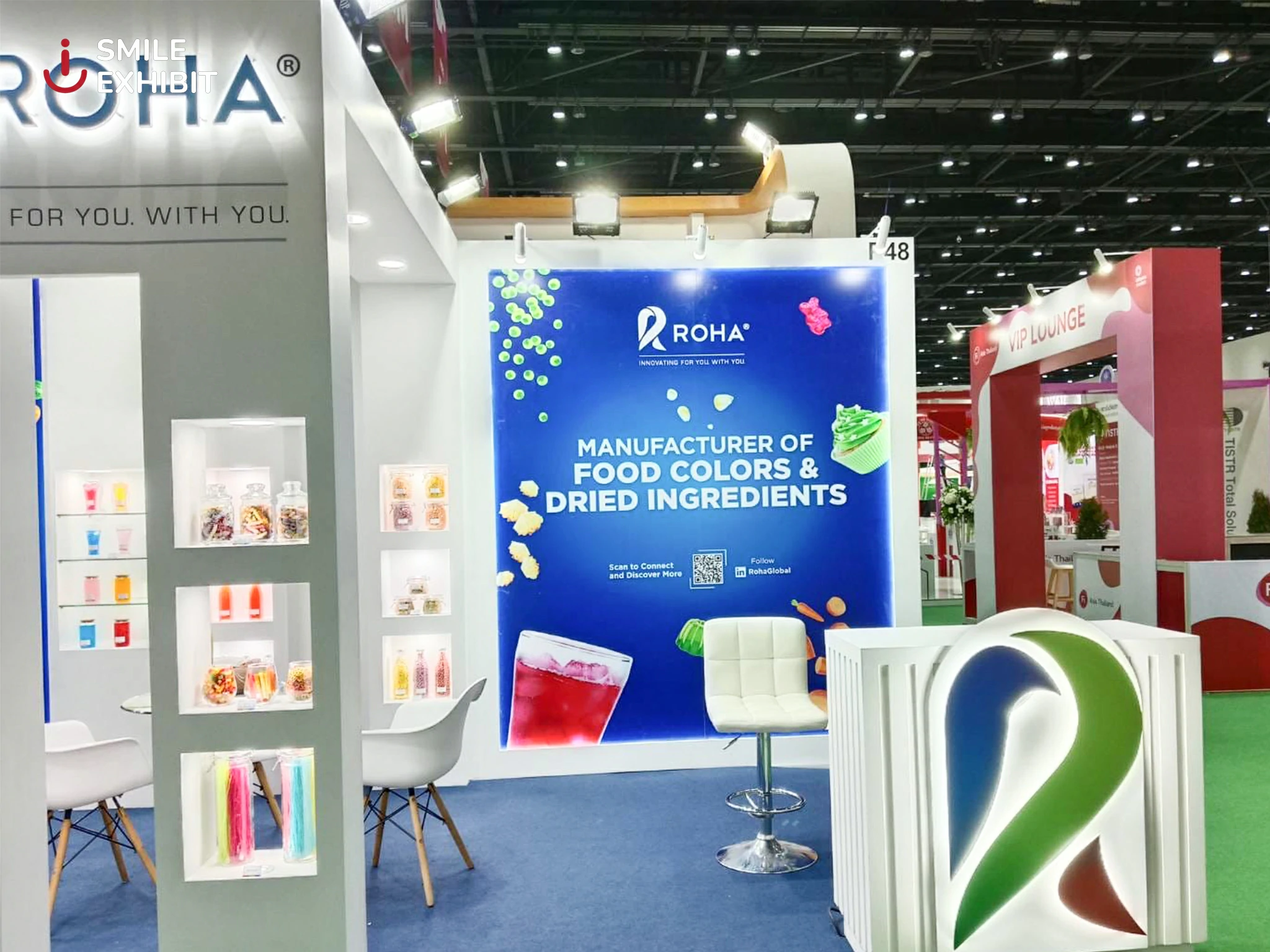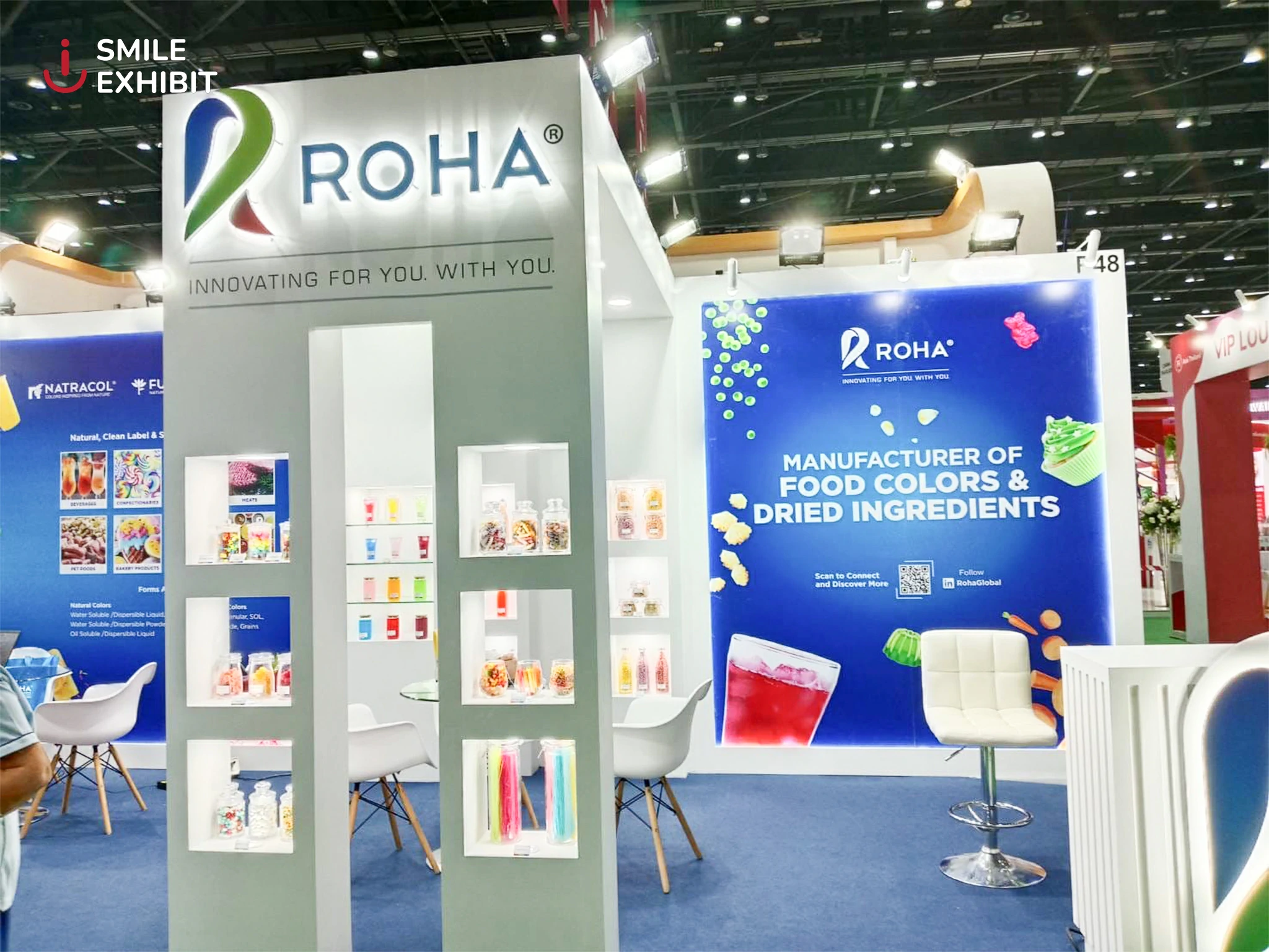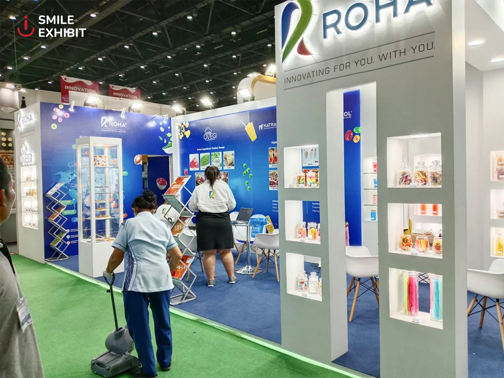 The ROHA booth at Fi Asia Thailand 2023 featured a clean, professional white-blue design with a large logo and spotlighted displays. Built-in product shelves and clear glass bottles emphasized hygiene and quality, while LED lighting added a modern, innovative touch reflecting the brands identity.