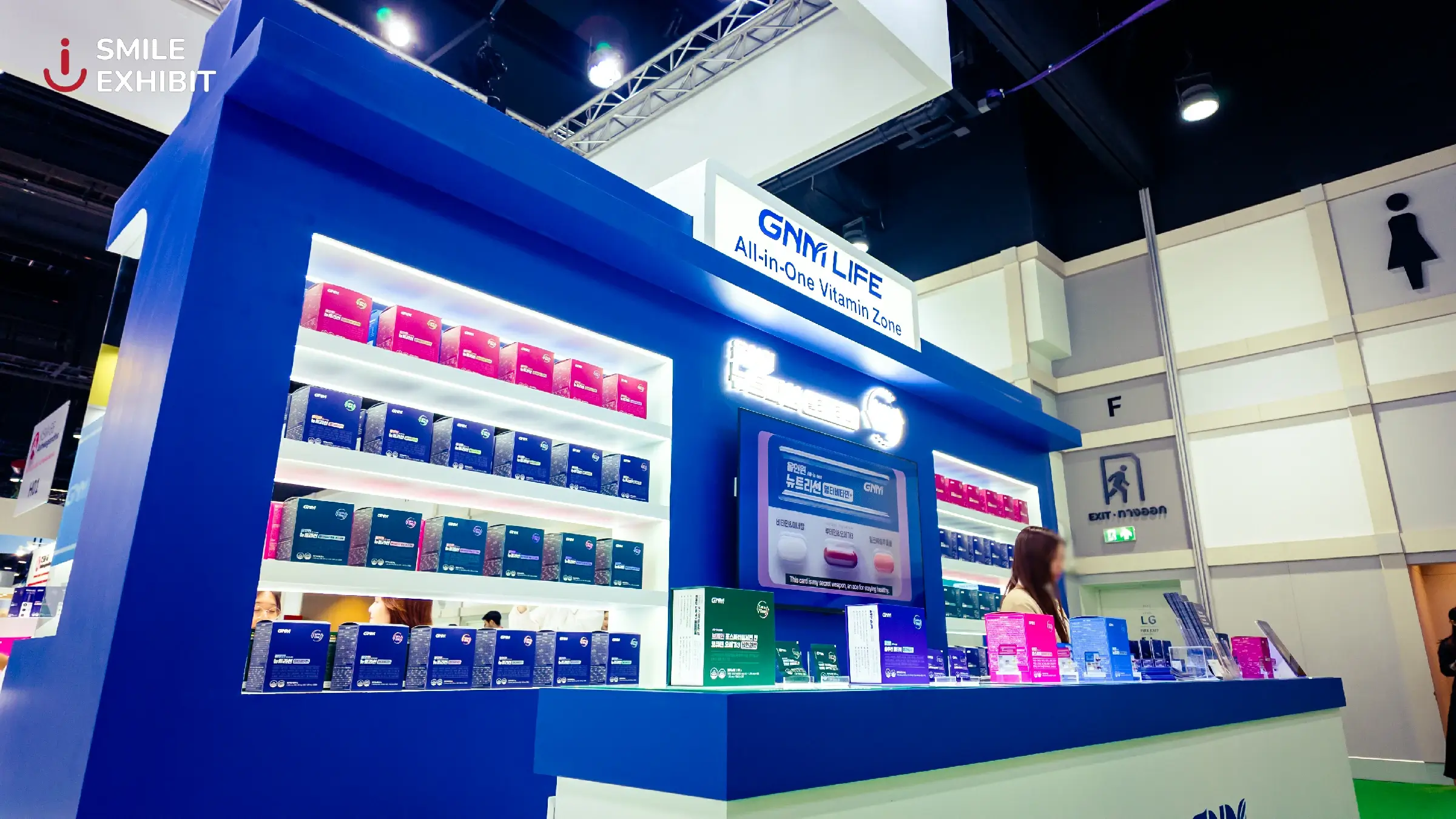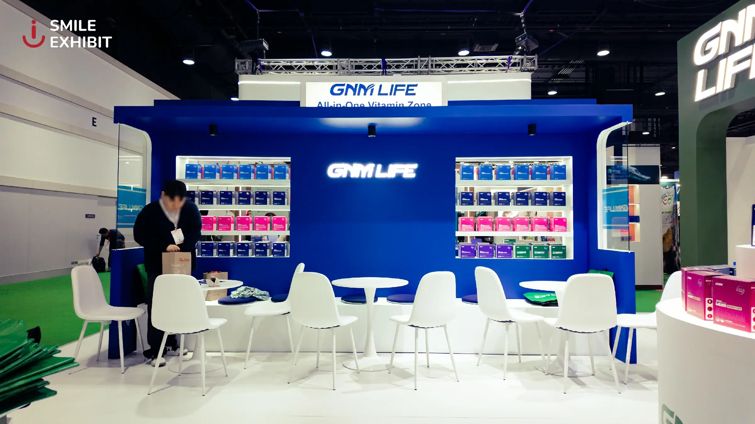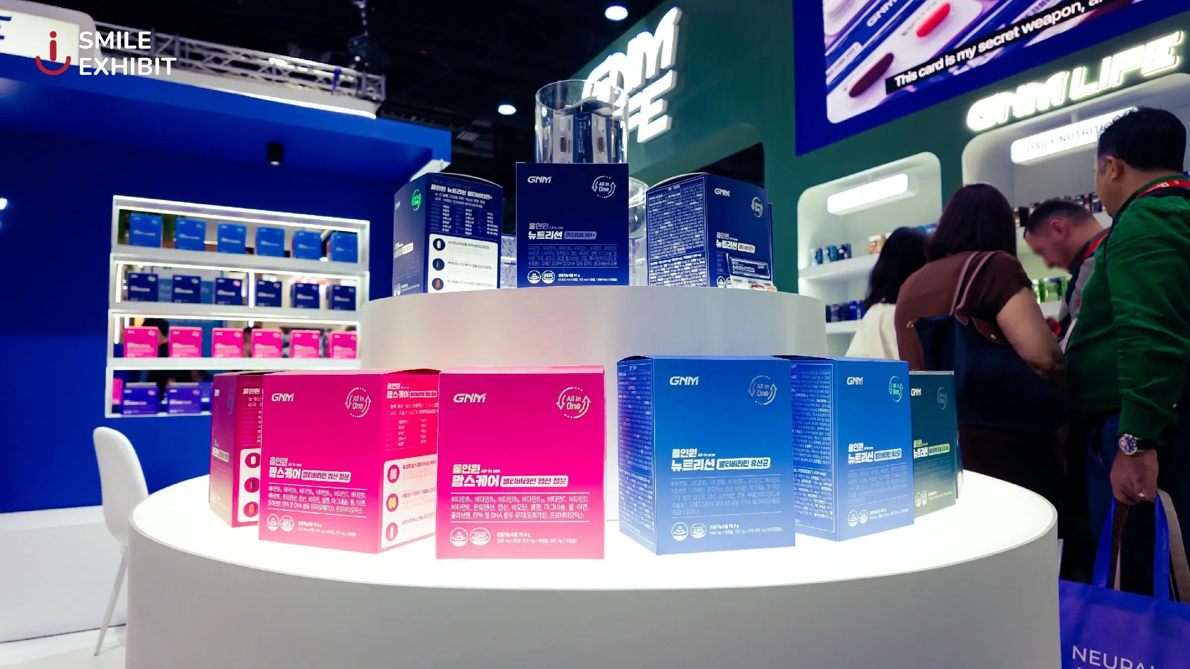 The GNM LIFE booth, a leading dietary supplement brand from South Korea, stands out with a modern design and a navy blue and white color scheme that reflects trust and high quality. White LED lighting brightens the entire booth, making the products on display more eye-catching.