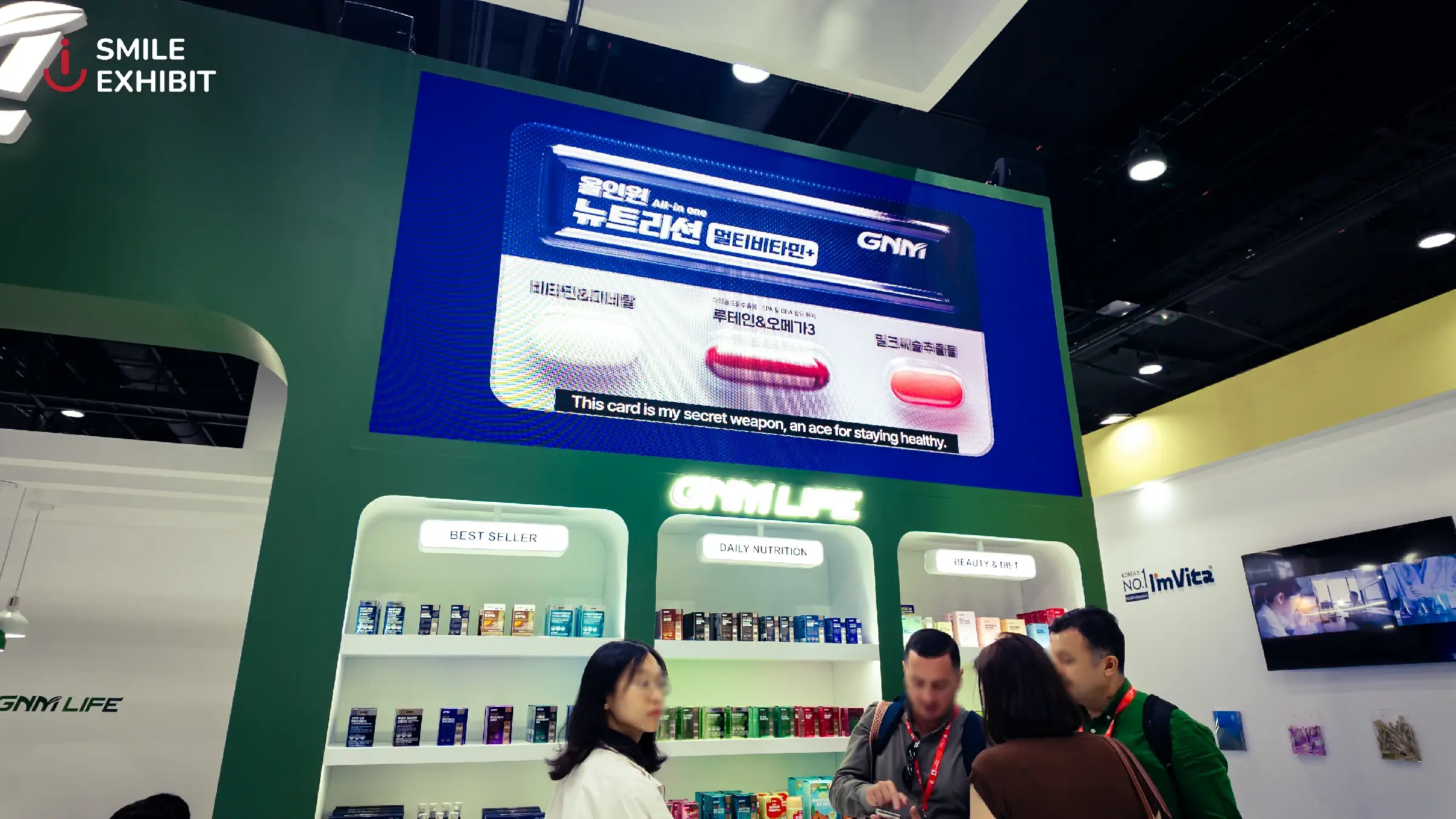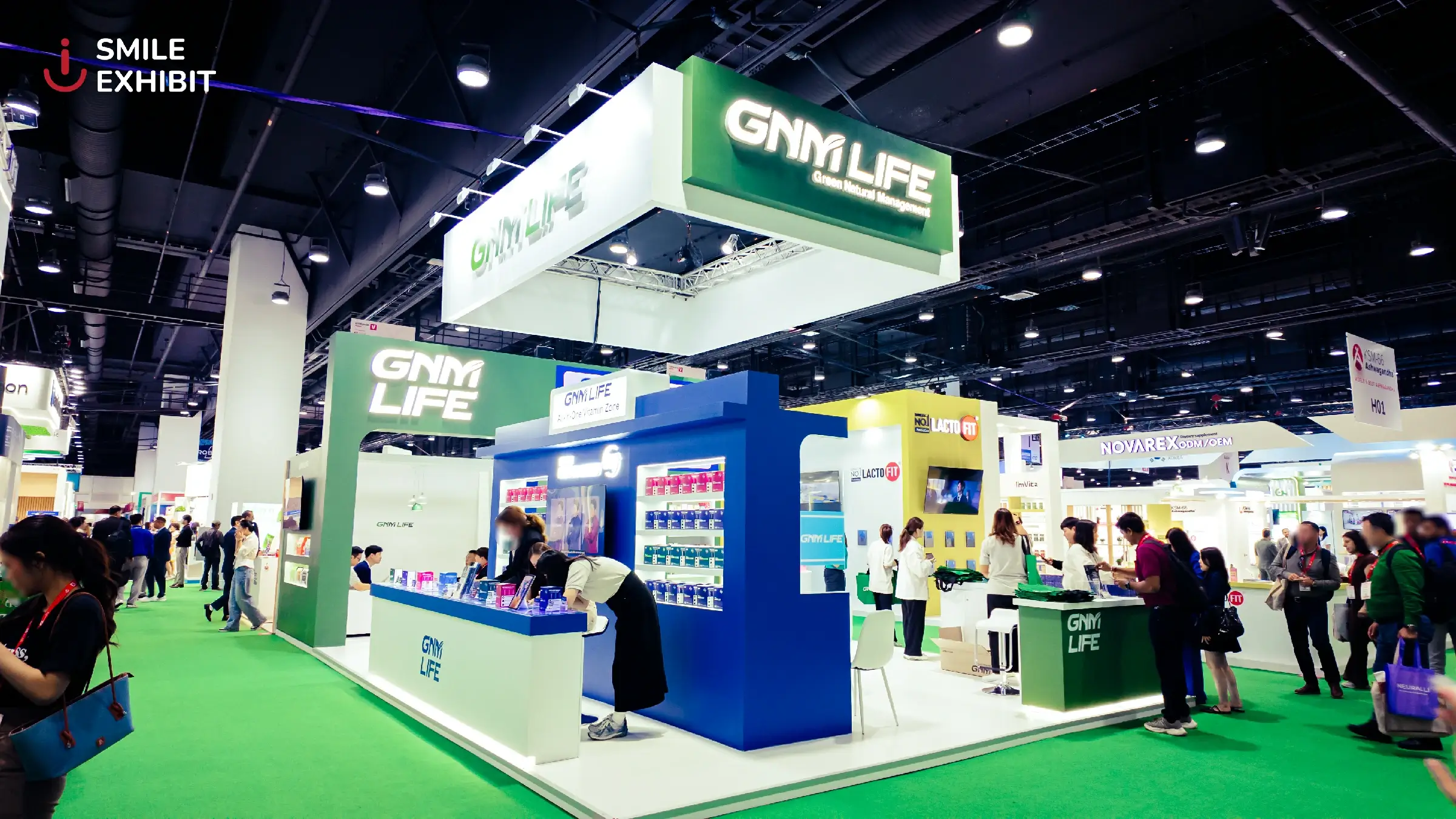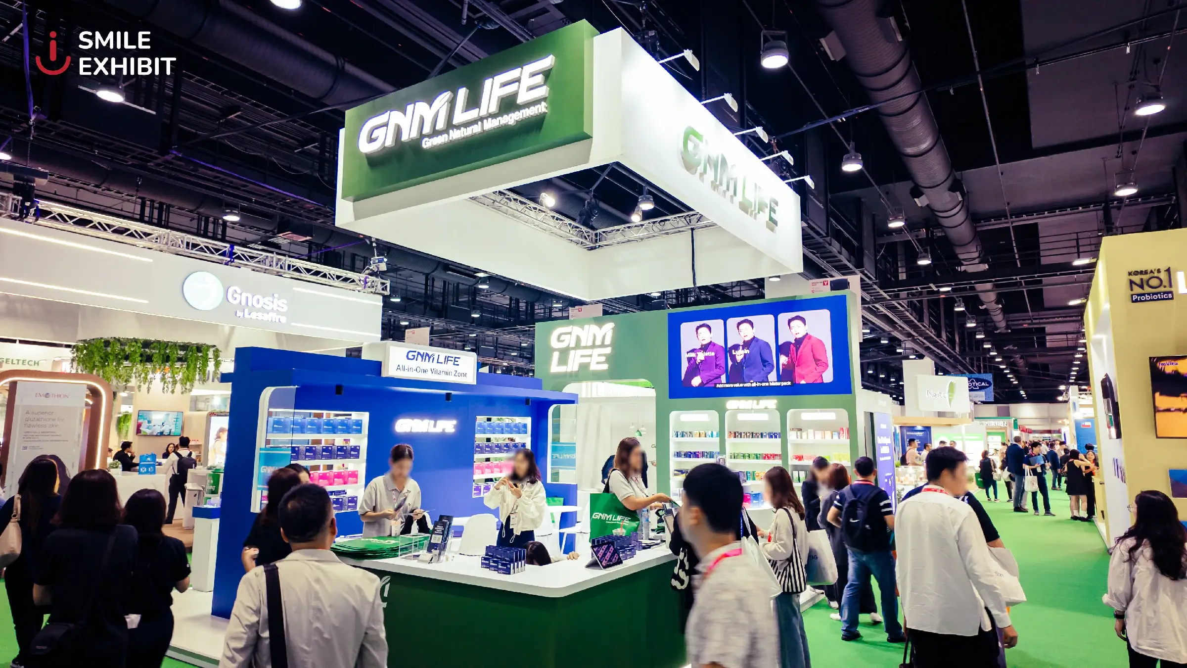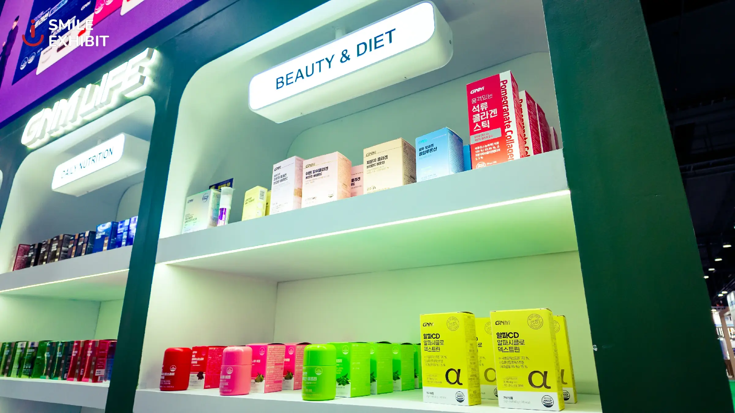 The GNM LIFE booth, a leading dietary supplement brand from South Korea, stands out with a modern design and a navy blue and white color scheme that reflects trust and high quality. White LED lighting brightens the entire booth, making the products on display more eye-catching.